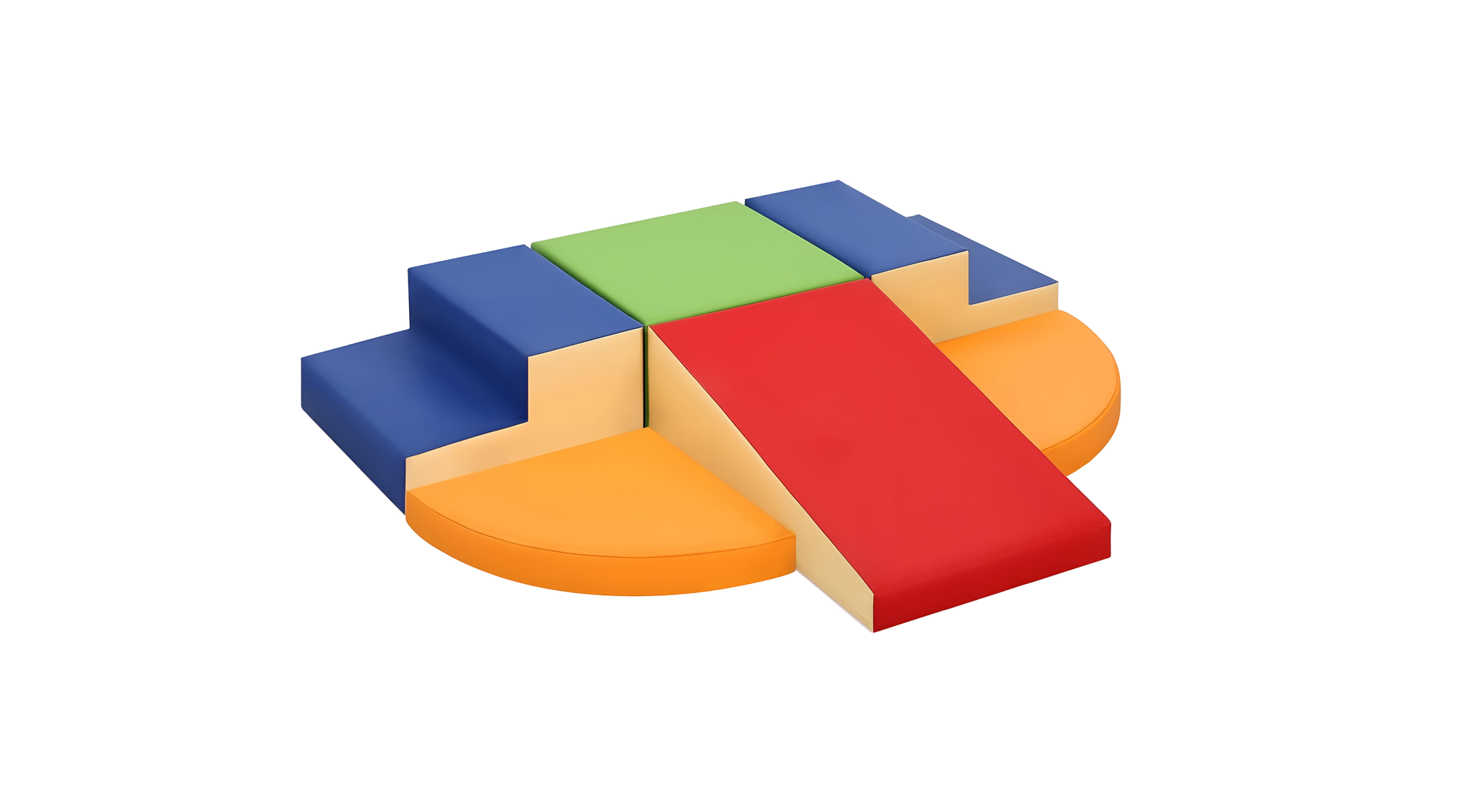Incluye 6 piezas; 2 escalones, una rampa, un cubo y dos triángulos cojines