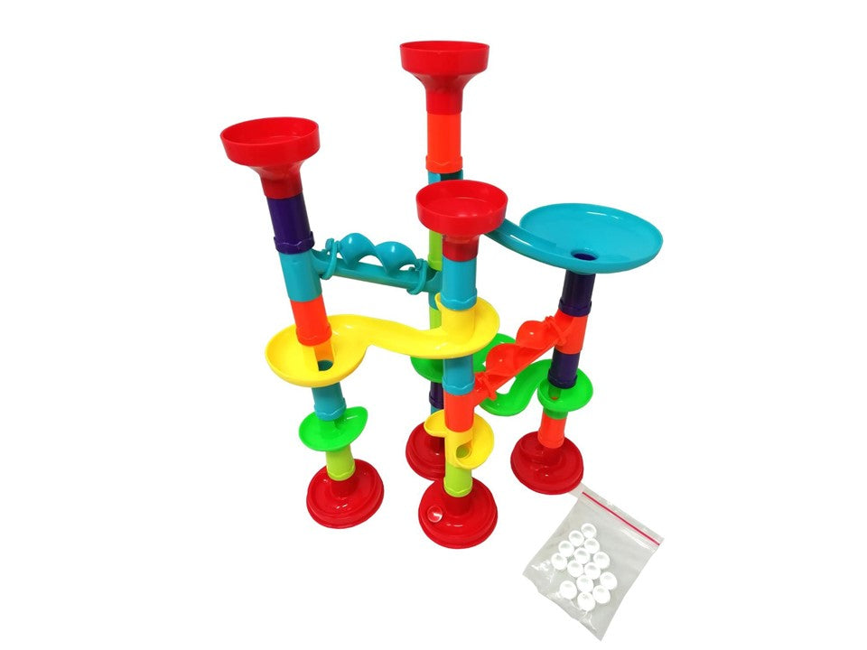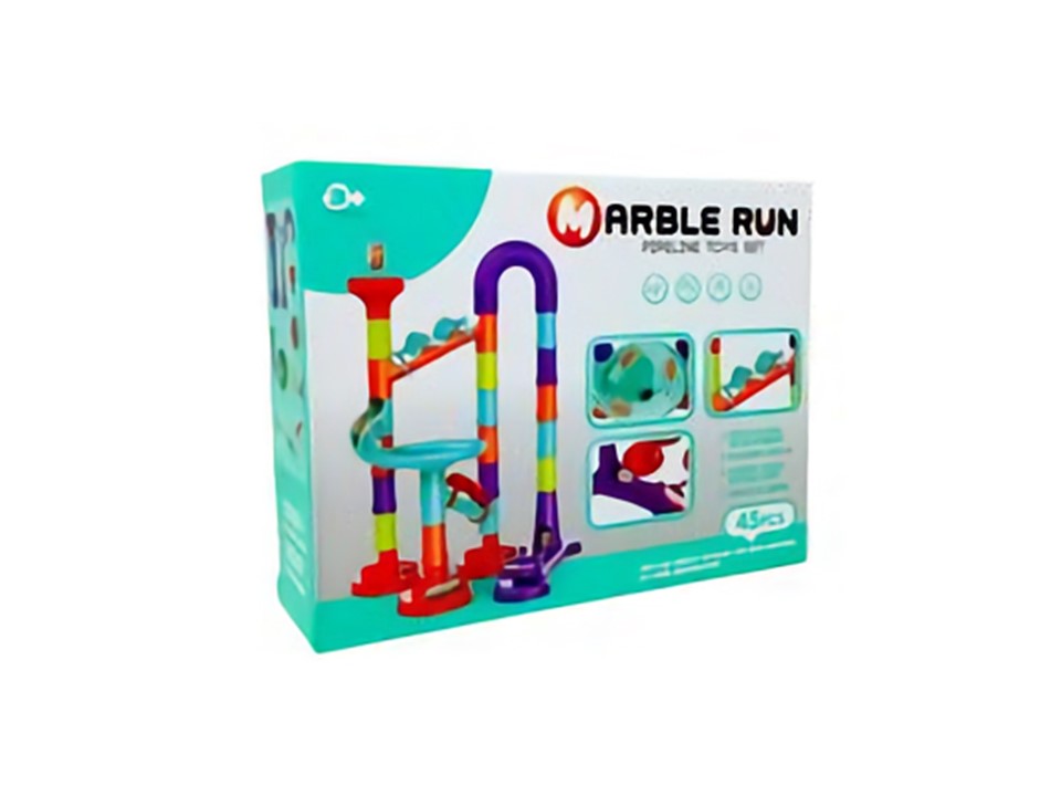 En el proceso de construcción, el niño puede reconocer los distintos colores de los bloques de construcción y captar la estructura y la sensación de espacio de los bloques de construcción. Juego de pista rodante de canica Incluye: 35 pzas de plástico rígido y en colores llamativos y 15 canicas